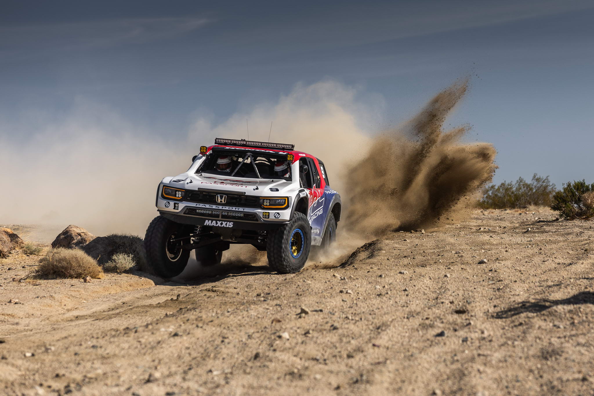 Making approximately 550 horsepower, HRC’s HR35TT 3.5-liter twin turbo engine uses the same block and cylinder heads as the production Honda 3.5-liter i-VTEC® V6. Additional, custom elements of the powertrain include an HRC-designed intake plenum and custom Engine Control Unit programming. The Honda Baja Passport Race Truck also features 24-inches of suspension travel in the front, 30-inches of travel in the rear and 40-inch tall tires.