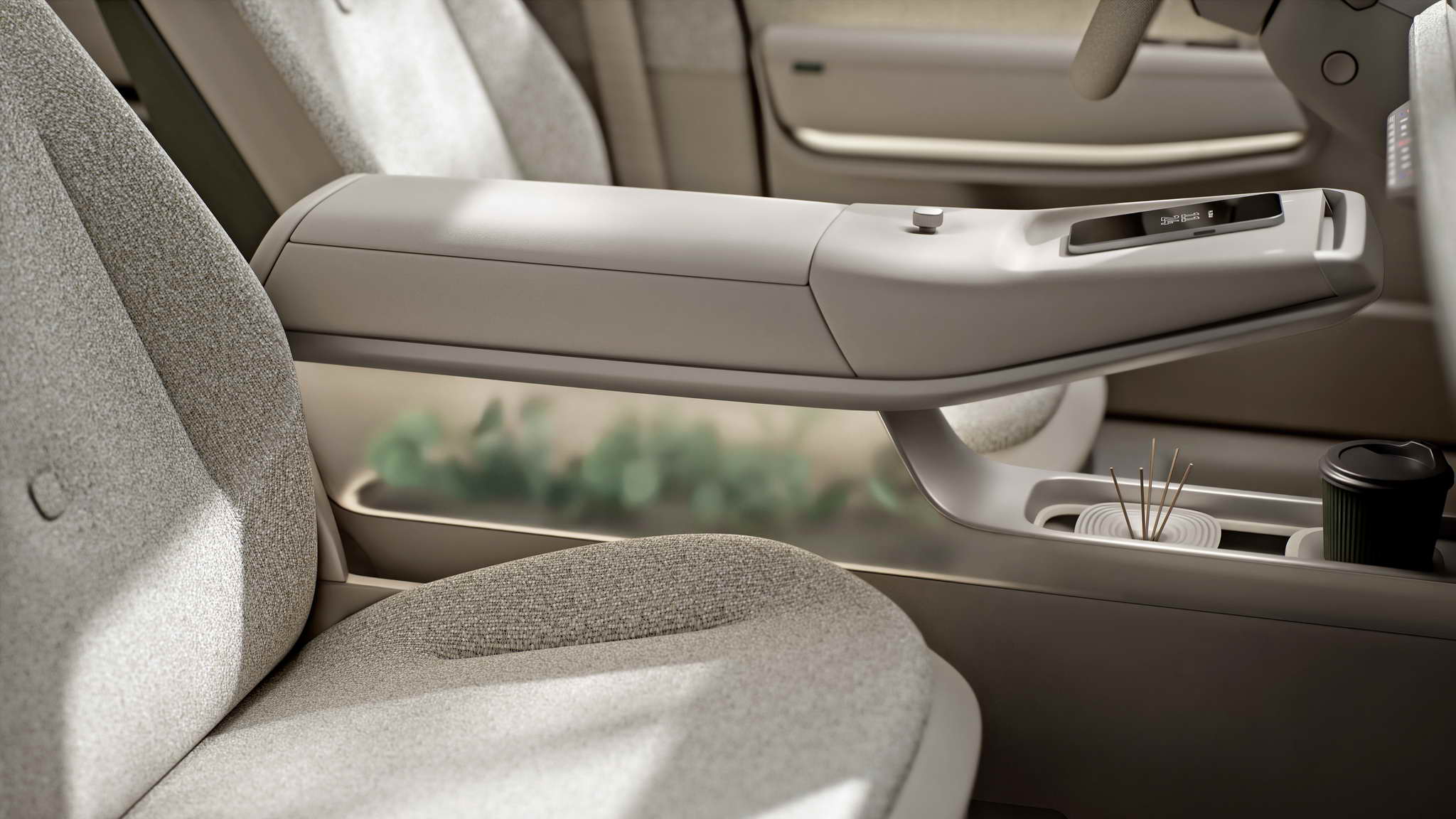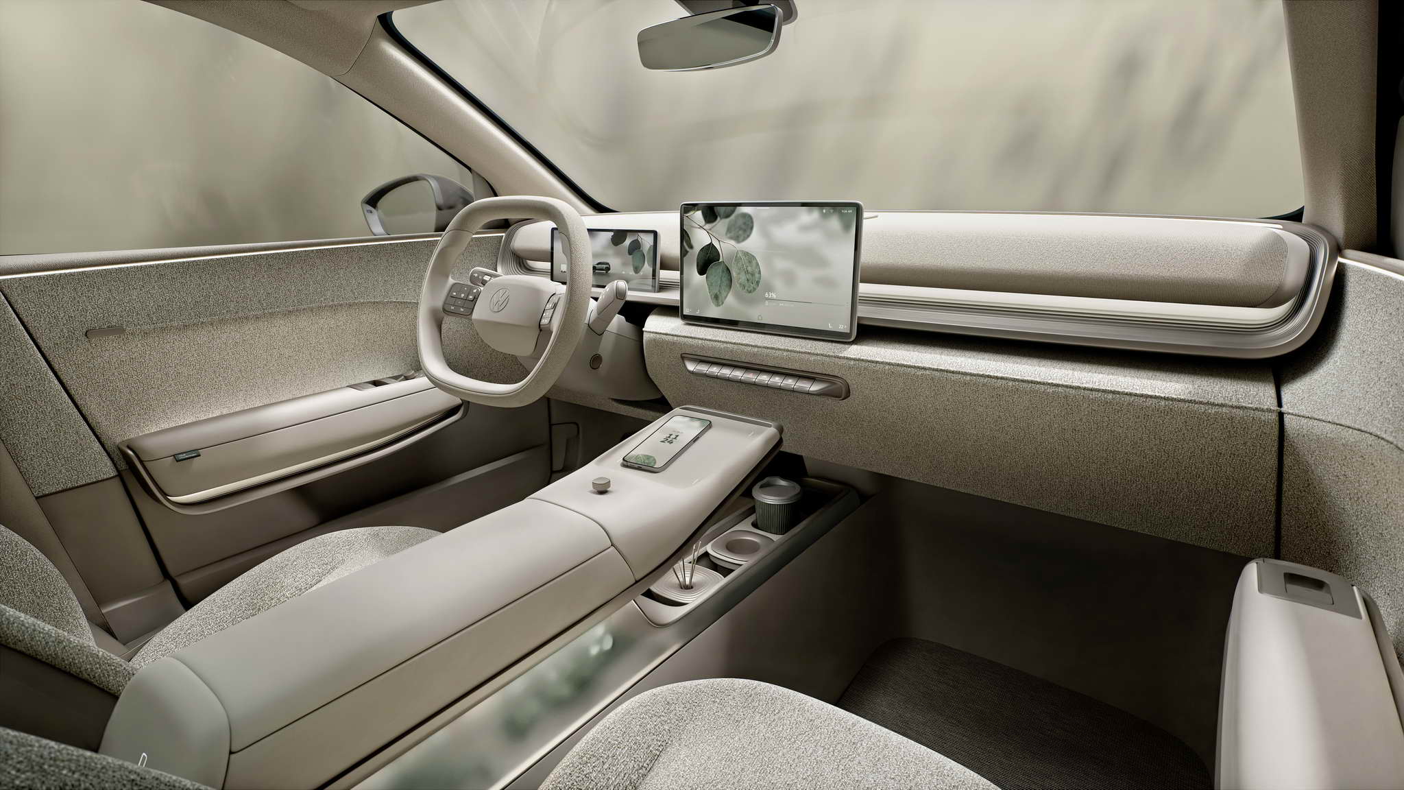 Interior oasis with a lounge-style ambience. The interior of the ID. CROSS Concept is designed as a feel-good oasis. It impresses with its outstanding material quality and feel, including fabric-covered surfaces. Pre-configured light, sound and climate modes (Atmospheres) transform the Vanilla Chai (a warm shade of beige) interior into a lounge that offers maximum comfort.